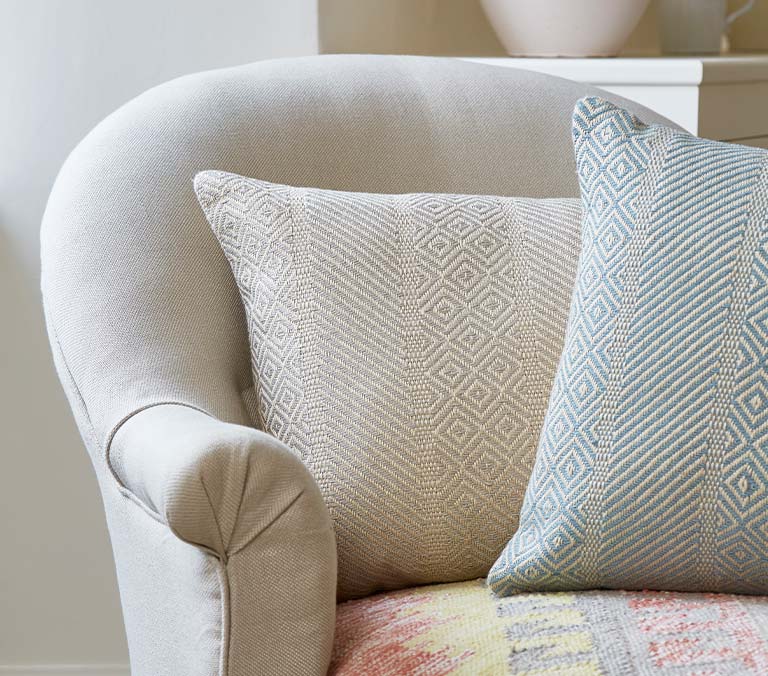 Recently updated from their original wool-like fabric to a new lightweight yarn, these cotton-feel Diamond Tabby Cushion Covers are soft, stain-resistant, machine washable and great for indoor and outdoor use. A perfect match for our heavyweight Diamond blankets, combine a scattering of these gorgeous cushions to complete the look.